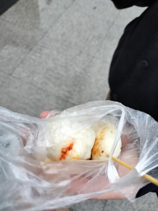 先ほど見かけた屋台で小籠包(ミニ肉まん)を買って来たようです。